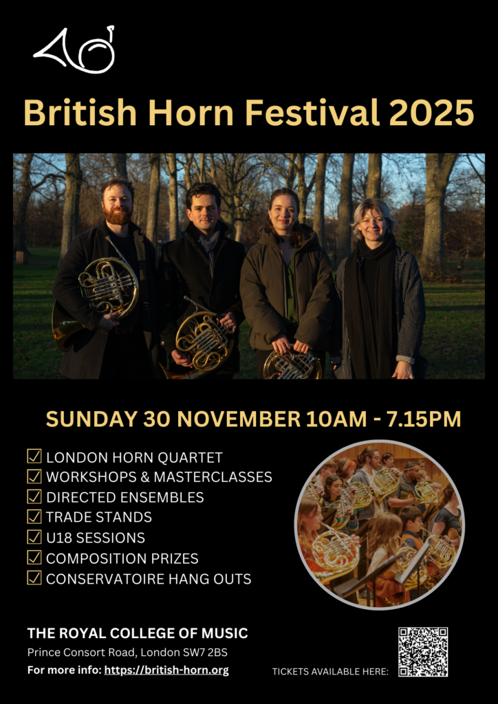 Sunday 30th November 10am-7:15pm Royal College of Music, London Join us in London for a jam-packed day of horn-playing fun and workshops! Where: Royal College of Music, Prince Consort Road, London SW7 2BS When: Sunday 30thNovember 2025 Time: 10:30 to 19:15 (Doors open at 10:00) Tickets: https://www.eventbrite.com/e/british-horn-society-bhs-festival-2025-tickets-1652892950309 An event for all ages and levels led by…